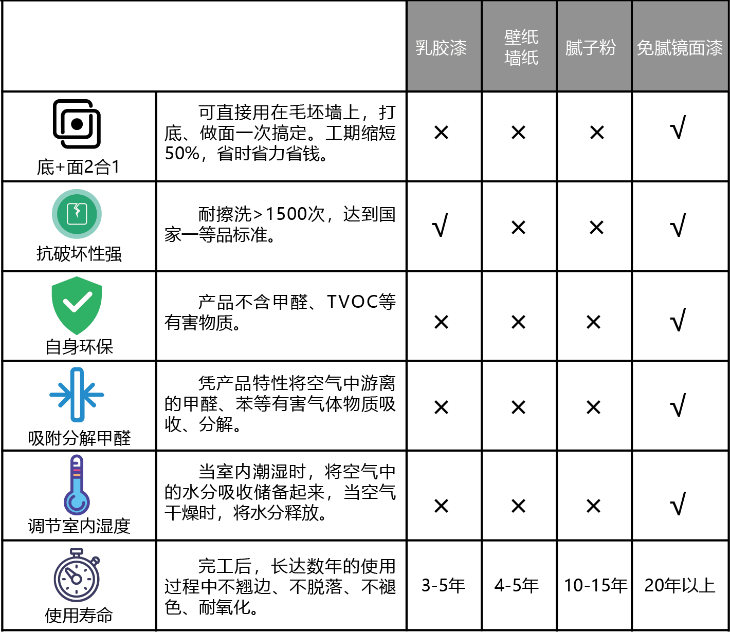 - 本產(chǎn)品原材料主要有碳酸鈣、無機膠凝材料、炭硅復(fù)合分子篩、氨基除醛因子、高效防霉因子等。是一款綜合了膩子、乳膠漆及功能涂料三者功能的“平民凈化產(chǎn)品”。在毛坯墻面上批刮2-3遍卡頌免膩鏡面漆,無需再面涂乳膠漆等其他涂料,即可完成從底到面的墻面裝飾,實現(xiàn)膩子找平、乳膠漆裝飾、耐洗刷、凈化室內(nèi)空氣等多重功效,省時省力更省心。卡頌免膩鏡面漆具有縮短工期、無需打磨、健康環(huán)保、防霉抗菌、防火阻燃、手感細膩、呼吸調(diào)濕、防開裂等特點。